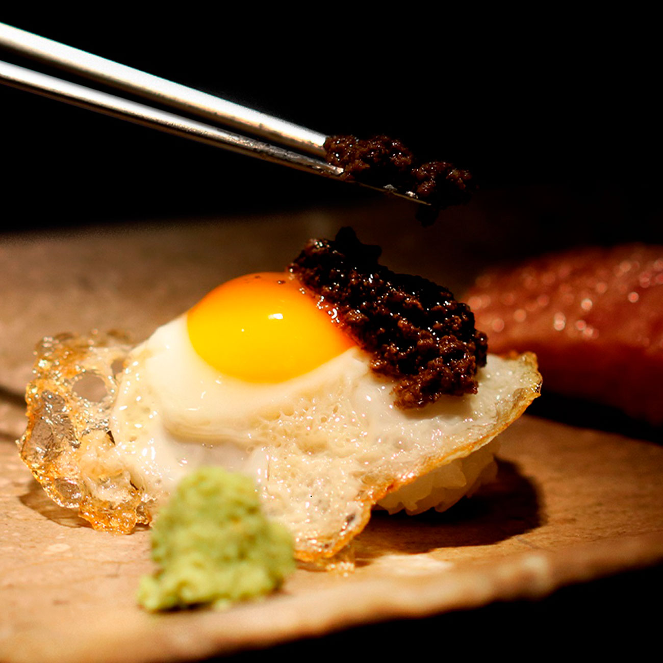 Entre los nigiris destacan el de lubina y chistorra, el de pez mantequilla pachicai –una salsa chifa a base de jengibre–, el de perucho –atún aperuchado con ají amarillo–, el de ventresca de atún, el de o´toro con trufa y foie anguila, el de vieira y caviar, el pulpo kunsei y el de wagyu con miso y yema de huevo.