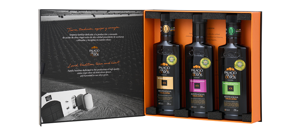 PALACIO DE LOS OLIVOS. Estuche con 3 botellas de 250 ml. de sus variedades Picual y Arberquina y Arbosana. Calidad, premios internacionales y sabor español.