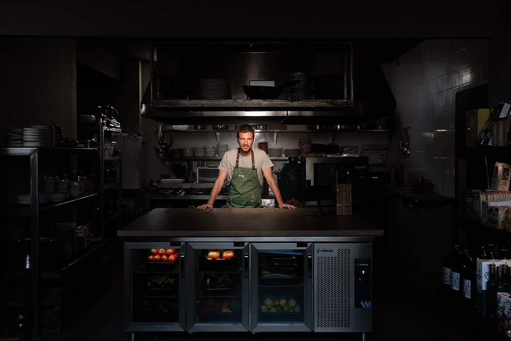Un espacio que acompaña: acogedor, elegante y lleno de pequeños detalles que reconfortan. Los tejidos puros y a la vez sencillos de la mantelería, la luz tamizada que entra por las ventanas a través de sus finos stores de bambú, los muebles de maderas naturales y los tonos acogedores que aportan las plantas y los tejidos, están diseñados para cuidar al cliente durante toda la comida. Una experiencia pensada y medida, pero nunca forzada, porque el placer de dar de comer también es el arte de acoger. “Para mí era indispensable prescindir de todo lo innecesario. Me inspiré en una casa contemporánea con la típica cocina americana y el comedor integrado en la barra de trabajo. El reto que me propuse fue crear un local eliminando al máximo las barreras arquitectónicas para abrir los espacios, ser prácticos y mostrar nuestro trabajo enseñando nuestras entrañas. Esto nos obliga a trabajar de forma limpia, ordenada y silenciosa”, recalca Carl Borg y destaca de la decoración: “recuperó gazpacheras, ollas de barro, presentó platos en sartenes y utilizó las llaunas típicas catalanas para los caracoles. Me encanta la cerámica de Baza, y tenemos distintas piezas de allí. También le damos importancia a los floreros, que me encargo personalmente de rellenar con ramas de piña, olivo, flores, romero… todo fresco. El espacio está lleno de ellos. En el comedor está el recetario de mi madre, el bastón de mi abuela y mucha decoración que viene de mi casa. El local también está lleno de fotos antiguas de Bedmar, el pueblo de mis abuelos y de mi madre, de donde proviene tanto mi aceite como el que usamos aquí”.