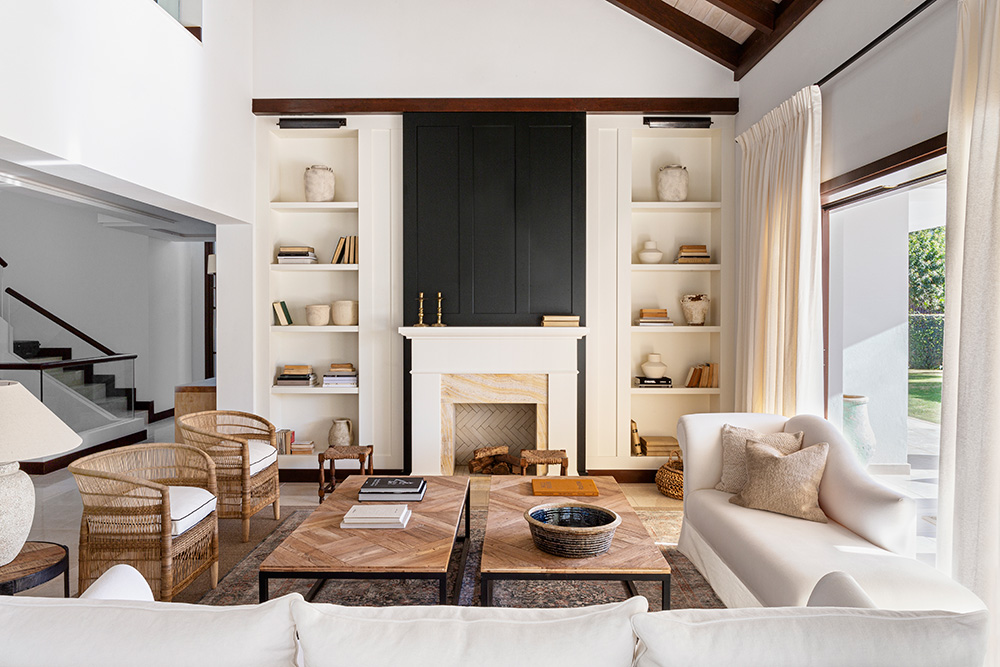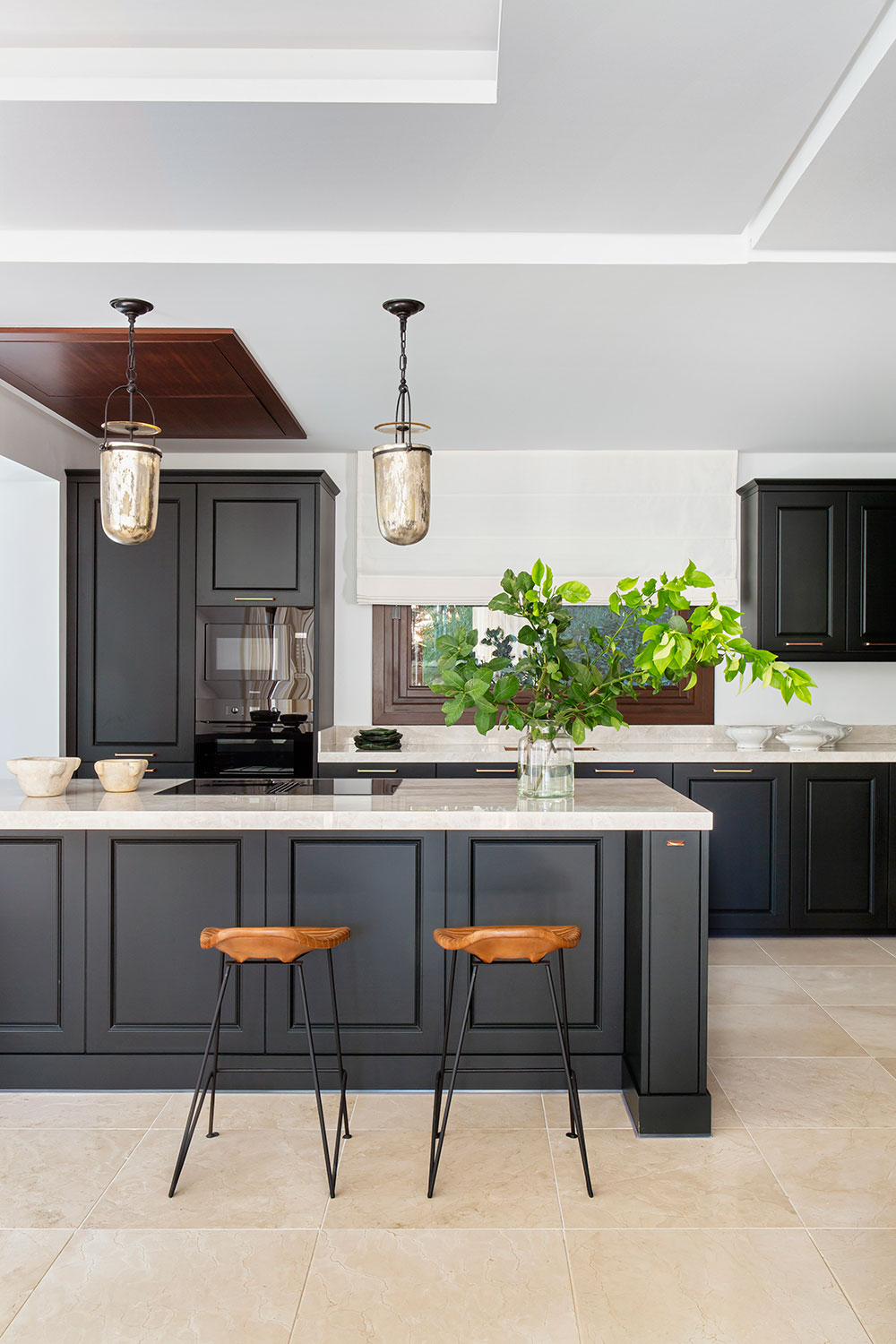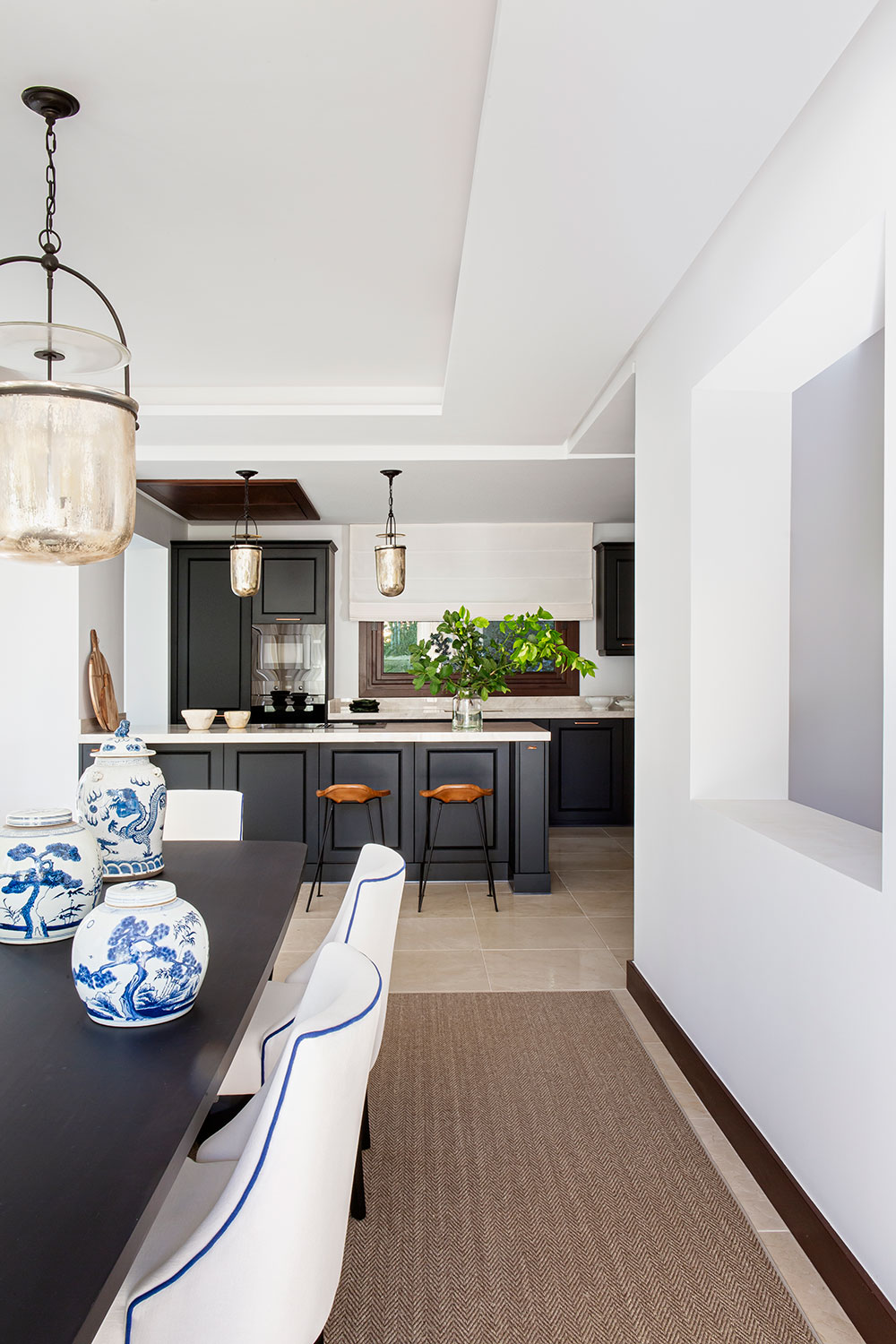 En el comedor, una gran mesa de roble negro mate para diez comensales (de 320 x 120cm), acompañada por lámparas tipo cesta con detalles en vidrio mercurizado, conecta con una cocina diseñada con el mismo tono lacado que la chimenea y con detalles en cobre, como el fregadero, el grifo y los tiradores. Esta zona fue la única en la que las interioristas intervinieron con obra. “Aunque no se trataba de una reforma estructural, hicimos una pequeña, pero muy significativa intervención. Eliminamos parte del cerramiento del porche para ganar metros al comedor y abrimos la cocina para integrarla en un único espacio fluido. Esto nos permitió no solo mejorar la circulación, sino también inundar toda la planta principal de luz natural y crear un ambiente mucho más social y acogedor”, explica Alicia Fuertes. Así pues, toda esta zona constituye, ahora, el corazón funcional de la vivienda. Un banco de obra conecta visualmente el comedor y la cocina, ofreciendo vistas directas a los olivos y limoneros del jardín.