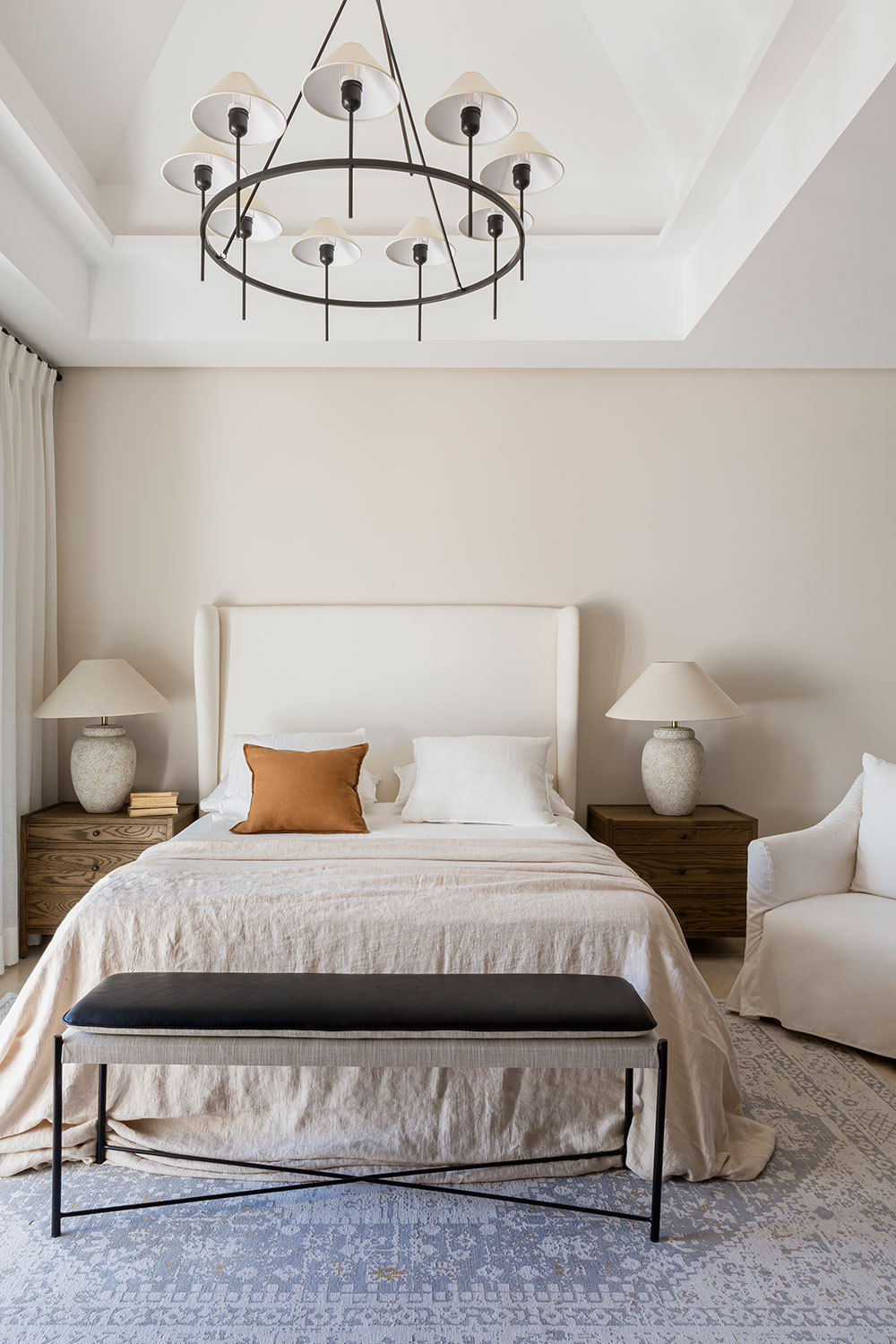 En la planta alta, se encuentran los dos dormitorios de la vivienda. El dormitorio principal destaca por su estética serena y refinada, con una lámpara escultórica de yeso blanco, cabecero en lino gris y una alfombra patchwork en blanco. Este máster cuenta con un vestidor cerrado y un baño, y tiene vistas a la piscina. Por su parte, en el dormitorio de invitados la cama está centrada por un banco con estructura de hierro, base de cuerda y cojín de piel negro; y combina un cabecero blanco roto, lámparas cerámicas envejecidas y una alfombra vintage en tonos azules. Ambos dormitorios cuentan con visillos de lino 100%.