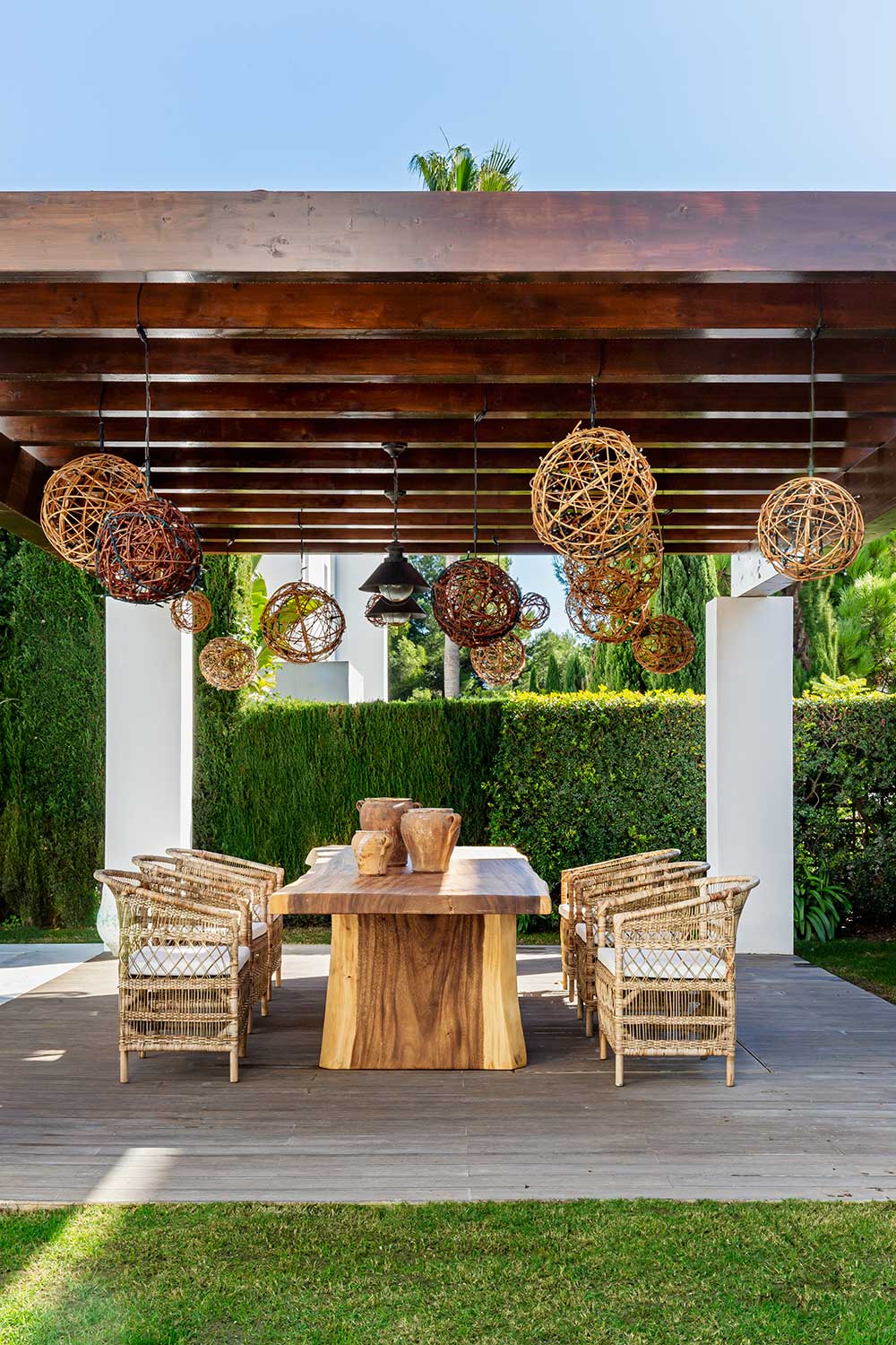El exterior, completamente integrado con el interior, se convierte en una extensión natural del hogar. El proyecto incluye una pérgola diseñada a medida para la zona de barbacoas, una gran mesa de madera de suar, iluminación exterior personalizada y una piscina de agua salada. También en esta planta se ubican una acogedora salita de lectura, un despacho con sofá cama y un aseo de cortesía.