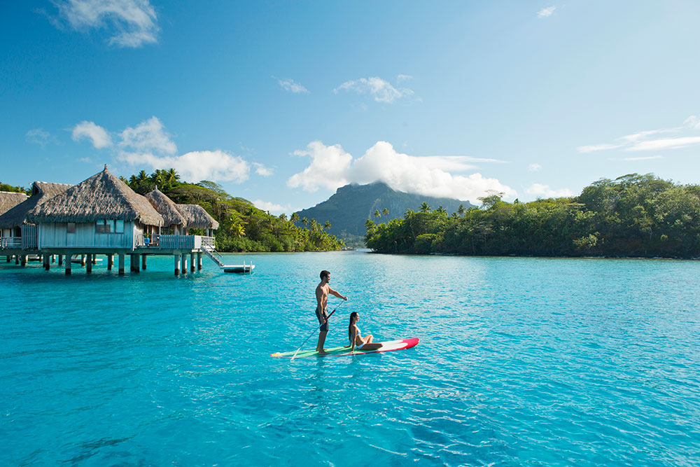 Foto imperdible: sobre una tabla de paddle surf, en medio de la laguna, con el Monte Otemanu como telón de fondo.
