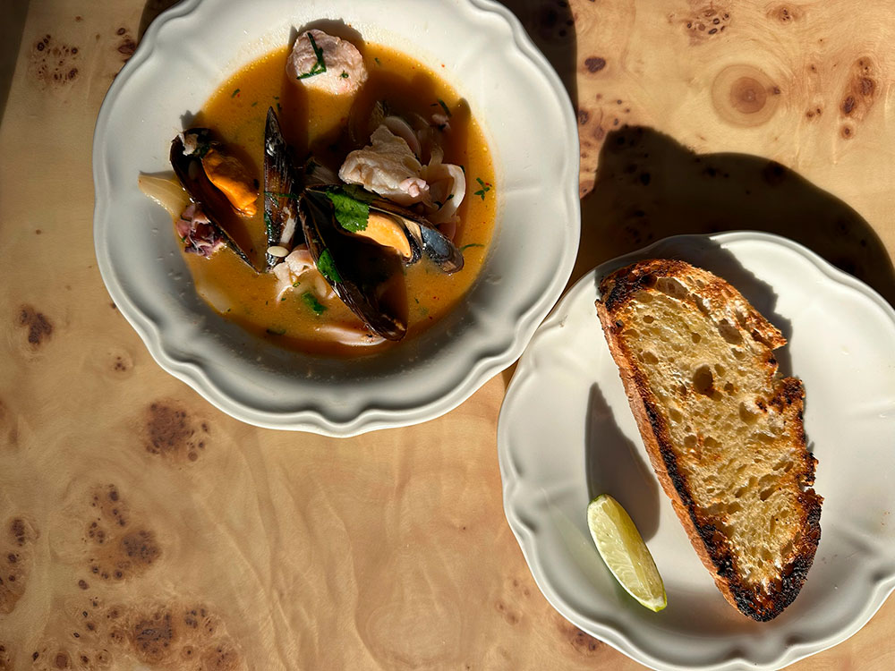 Es un plato de invierno concebido para compartir, puramente reconfortante, que evoca los sabores del Mediterráneo desde una perspectiva balcánica. Su caldo, sabroso y aromático, se enriquece con licor de pastis que aporta notas anisadas sutiles, cercana en frescura y profundidad a una bullabesa, pero con un perfil menos invasivo y más delicado. La sopa se completa con pasta puntalete, hinojo laminado, cebolla en pluma, dados de pescado blanco, chipirón en anillas y mejillón fresco. Un plato que reconforta el cuerpo en esta temporada invernal, con un delicado toque picante y luminosidad gracias al cilantro fresco picado.