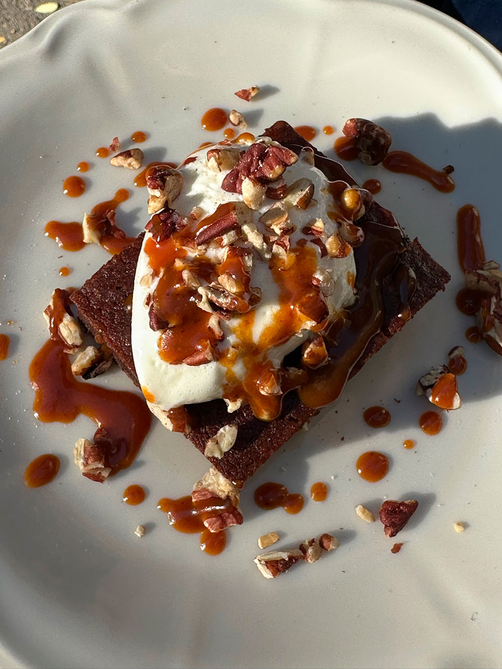 Este bizcocho húmedo y templado es un verdadero abrazo invernal, cargado de la dulzura natural del dátil y un ligero toque de canela. Las nueces pecanas aportan textura crujiente, mientras que la quenelle de nata montada y el toffee de caramelo salado tibio redondean la experiencia con una evocación a los mercados navideños del centro de Europa, pero con el sello innovador y mediterráneo que caracteriza a NORAH. Un postre que conjuga tradición y modernidad, ligando la riqueza del dátil, fruto emblemático del Mediterráneo, con técnicas y sabores consagrados.