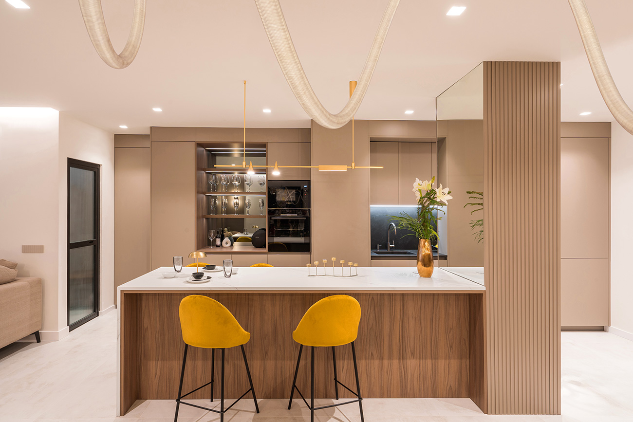 En el corazón de la vivienda, la cocina se erige como un punto central, con una impresionante isla de casi 3 metros en porcelánico, complementada por encimeras en acabado marmóreo y una exquisita combinación de madera de nogal y panelados lacados en color topo ultramate. Este espacio multifuncional no solo es un punto focal estético, sino también un lugar ideal para compartir momentos inolvidables.