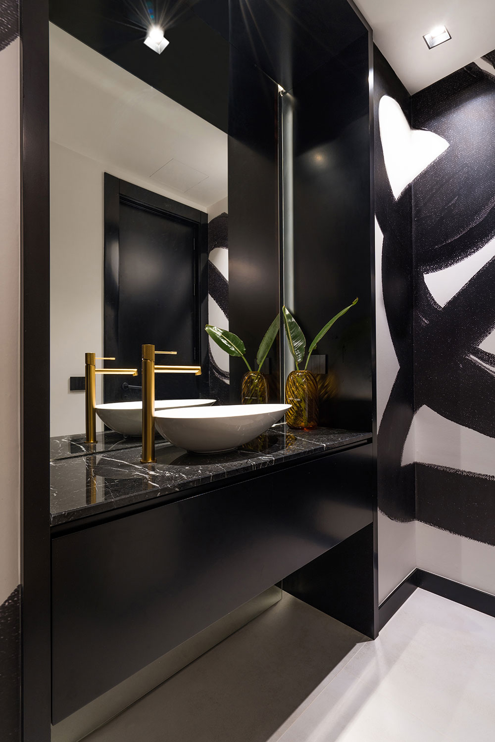 Destaca el conjunto del cabecero XXL y las mesas de noche en materiales nobles como mármol, latón y madera. El vestidor, con tonos bronce y vidrios en acabado fumeé, dota al espacio de teatralidad y sofisticación.