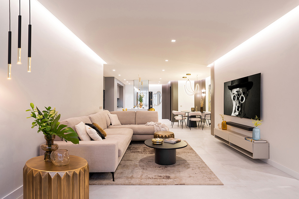 Ubicados junto a los grandes ventanales que inundan la vivienda de luz natural, el salón y el despacho se integran en un mismo espacio junto al comedor y la cocina, manteniendo una sutil diferenciación entre cada ambiente. En el área central, un amplio sofá en tono nude con chaise longue, acompañado de una mullida alfombra a medida, configura un entorno distinguido y acogedor. Los detalles en dorado y acabados metálicos aportan calidez y refinamiento al conjunto. En la zona más retirada, el rincón de lectura se convierte en un refugio de serenidad.