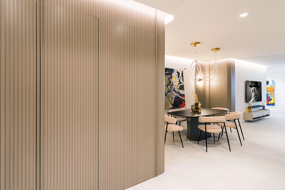 Frente a la cocina, el comedor se despliega en un entorno envolvente definido por una llamativa pared curva que, además de otorgar dinamismo al espacio, guarda uno de los mejores secretos de esta vivienda: accesos ocultos de suelo a techo. Estas puertas integradas, diseñadas a medida por In Out Studio, conducen a la suite principal, el dormitorio de invitados y el aseo de cortesía, garantizando privacidad sin alterar la continuidad visual.
