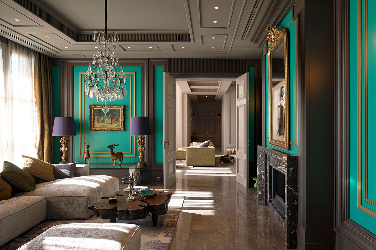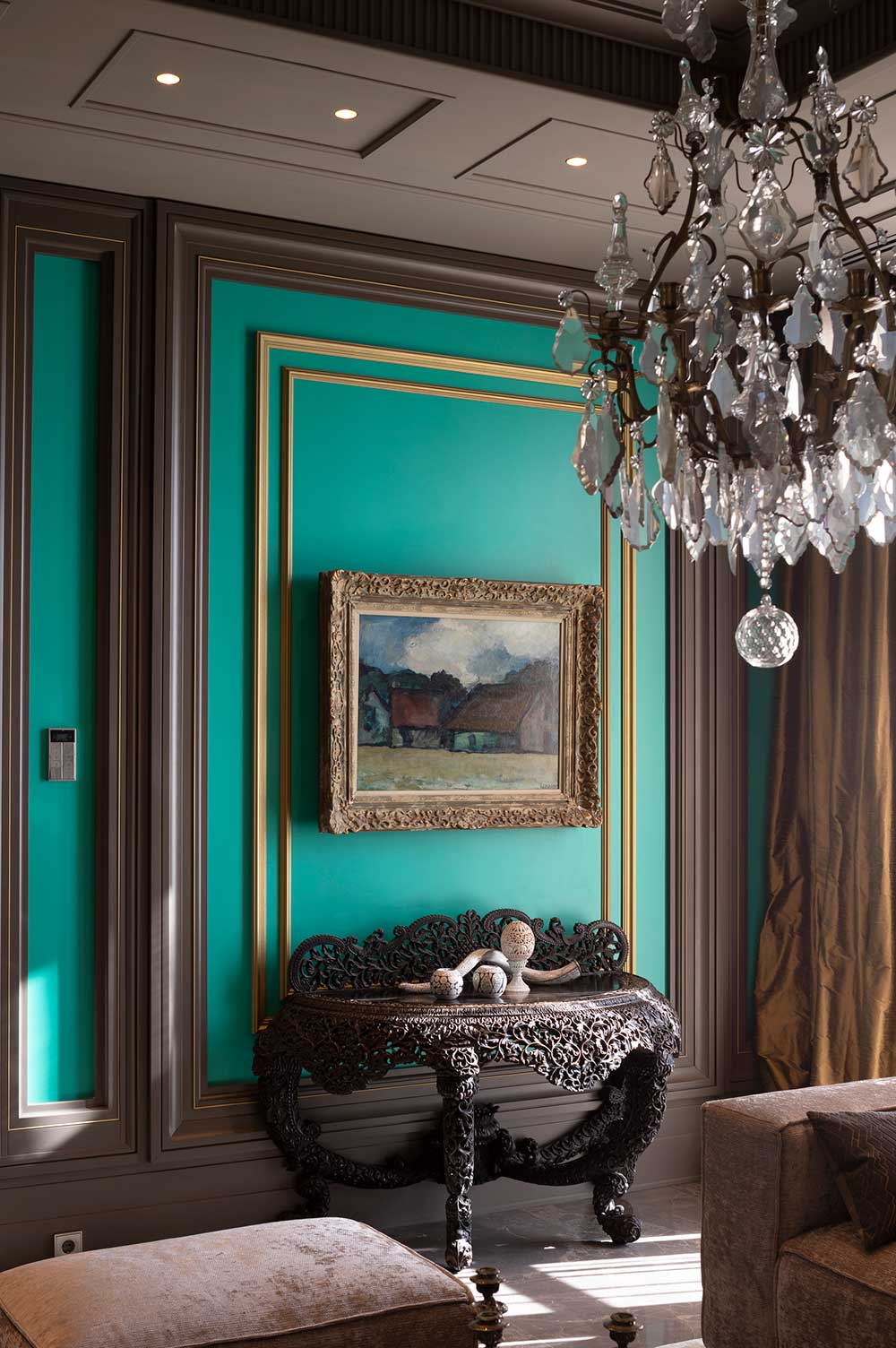 El trabajo del color es un verdadero must en esta estancia: las paredes en un azul verdoso profundo envuelven el espacio con personalidad, mientras las molduras en gris oscuro con perfiles dorados aportan contraste y refinamiento.