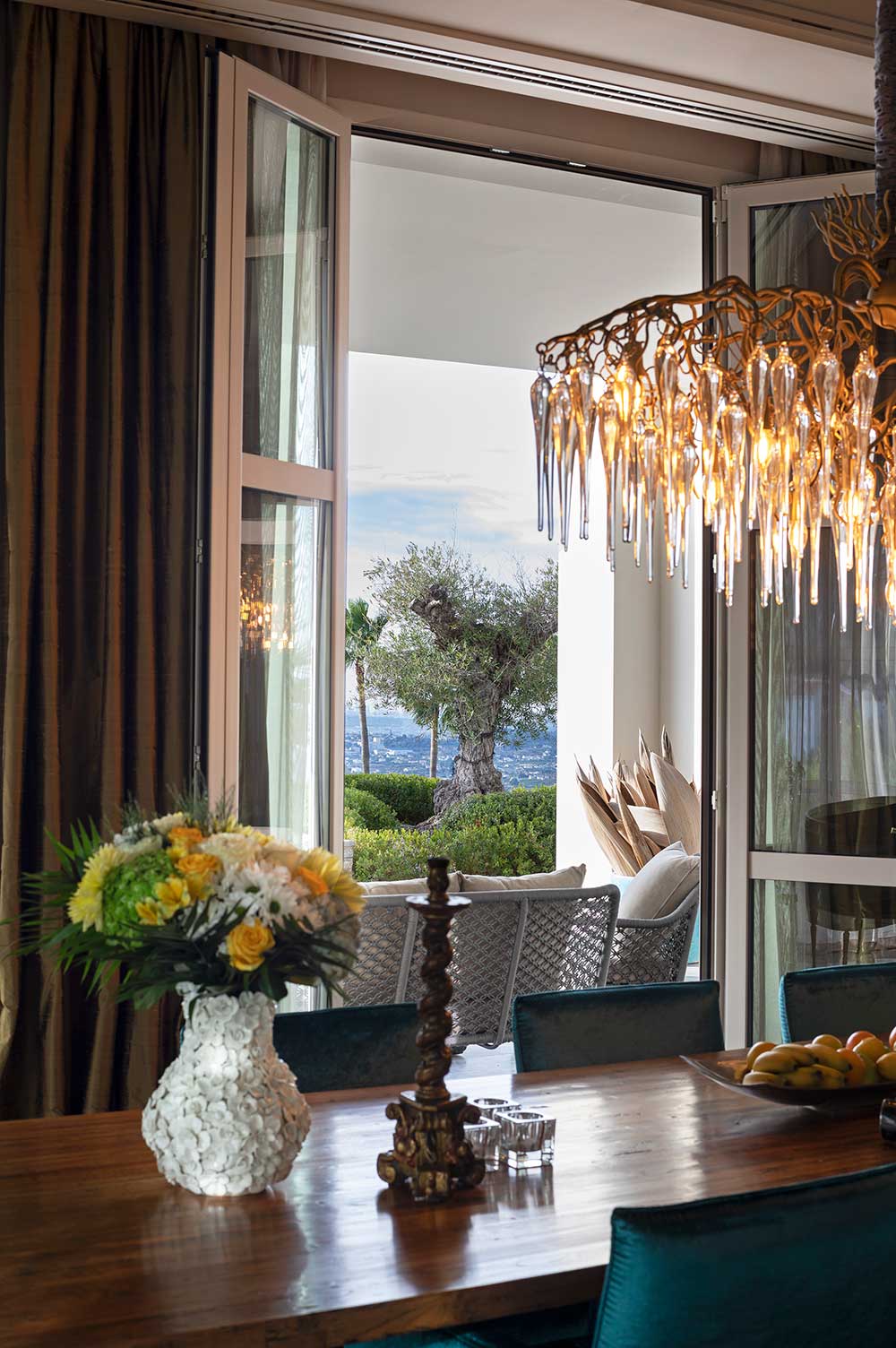 A ambos lados de los ventanales, nace uno de los dos salones de la vivienda, donde Anvana Architects ha apostado por aportar profundidad y luz con espejos de suelo a techo enmarcados, de textura vintage. Grandes lámparas de araña de cristal penden del techo, mientras que el sofá, tapizado en terciopelo color oliva, aporta una nota cálida y sofisticada al conjunto.